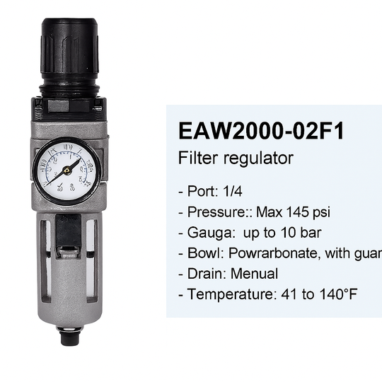 El modelo EAW2000-02F1 es un filtro regulador neumático de 1/4" con manómetro en bares, ideal para mantener presión estable y aire limpio en sistemas industriales. 🔧 Especificaciones técnicas Modelo: EAW2000-02F1 Tipo: Filtro regulador FR (Filter...Precio regular $ 1,564.54Precio regular $ 1,564.54 -