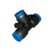 El conector neumático T EPE3/8 está diseñado para unir tres tubos de 3/8" de diámetro exterior, ideal para sistemas de aire comprimido y vacío.