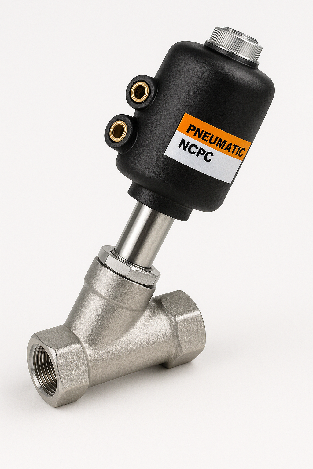 La válvula EMC-20-50B es una válvula angular de 3/4" NPT, totalmente fabricada en acero inoxidable, con actuador neumático de simple efecto y función normalmente abierta (N.A.).