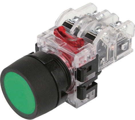 El pulsador MRF-TM1G de HANYOUNG NUX es un botón industrial de 22mm con guarda plástica extendida, acción momentánea, color verde. Diseñado para aplicaciones industriales que requieren control momentáneo, protección extendida contra activación accidental y señalización de inicio/activación.