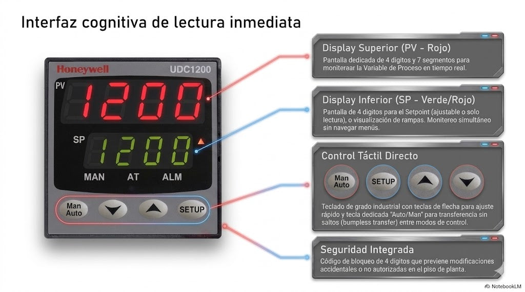 Control PID con Algoritmos de Precisión: Incorpora el avanzado algoritmo de control Proporcional, Integral y Derivativo de Honeywell con función de Auto-Tuning. Esta tecnología permite que el controlador "aprenda" dinámicamente el comportamiento del sistema para alcanzar el punto de consigna sin oscilaciones.