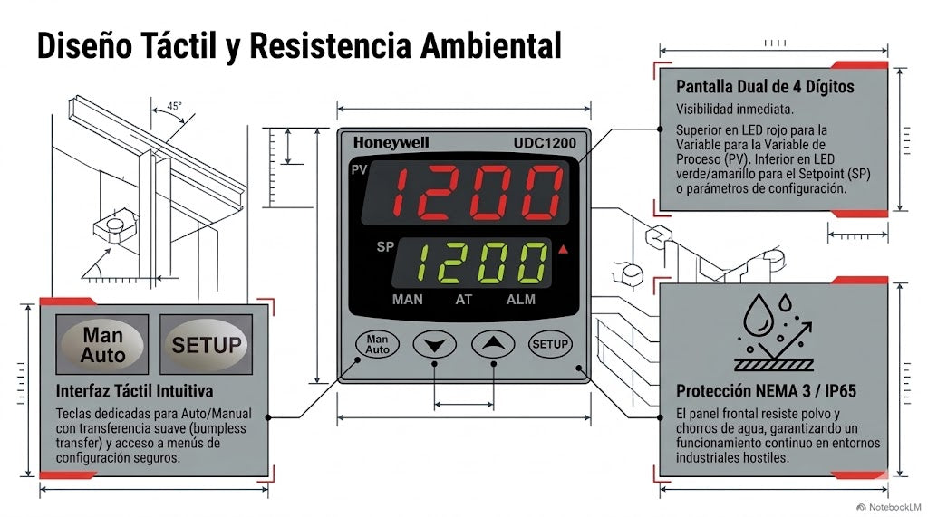 Control PID con Auto-Tuning de Honeywell: Incorpora algoritmos avanzados de control Proporcional, Integral y Derivativo. Su función de auto-sintonía identifica automáticamente las constantes dinámicas del sistema, asegurando que el proceso alcance el punto de consigna sin oscilaciones ni sobretiros.