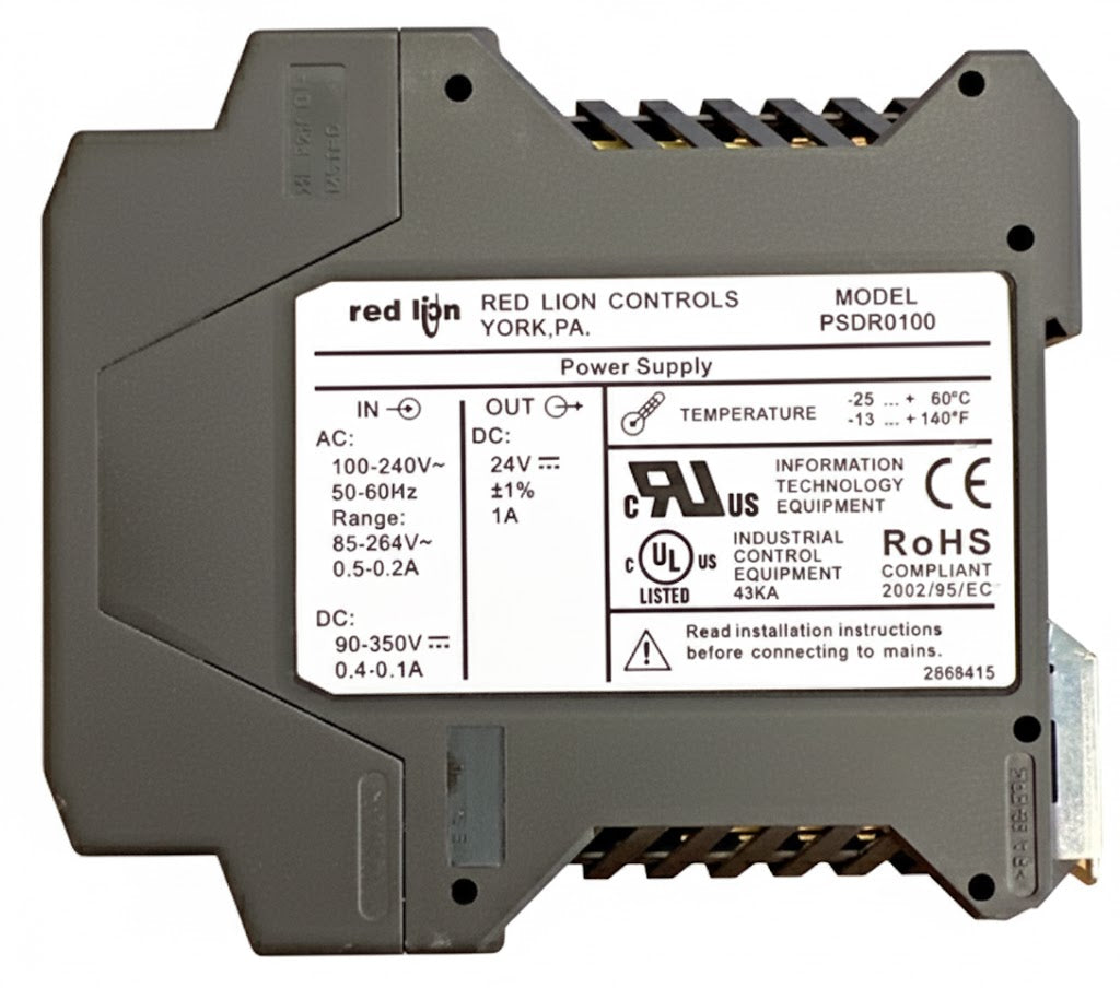 Los módulos se montan fácilmente en rieles DIN planos estándar de 35 mm y utilizan bloques de terminales extraíbles para un cableado sencillo. PSDR0100