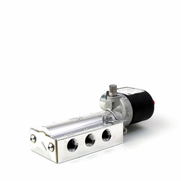 7131KBN2BF00 Válvula solenoide 3 vías, acción directa NC, cuerpo de latón, conexión 1/4" NPT, orificio 1/32", cv 0.020, presión de 0-1100 PSI en CA y DC, sellos de ruby
