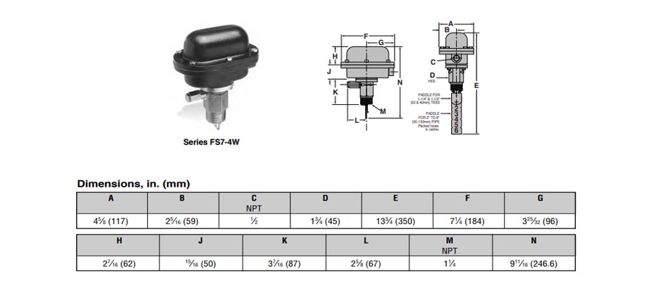 El número de modelo FS7-4W de McDonnell & Miller es un interruptor de flujo de líquido a presión de 120 voltios, NEMA 4x, unipolar, tiro doble, para aplicaciones requeridas para ser hermético al agua y al polvo. Este interruptor tiene una conexión en línea MIP de 1-1 / 4 "para instalar en una T y viene con una paleta para tubería de 2" a 6 ". También tiene un tornillo de ajuste de sensibilidad para un fácil ajuste de flujo, una temperatura máxima de 300 ° F, y una presión de operación de 300 psi.