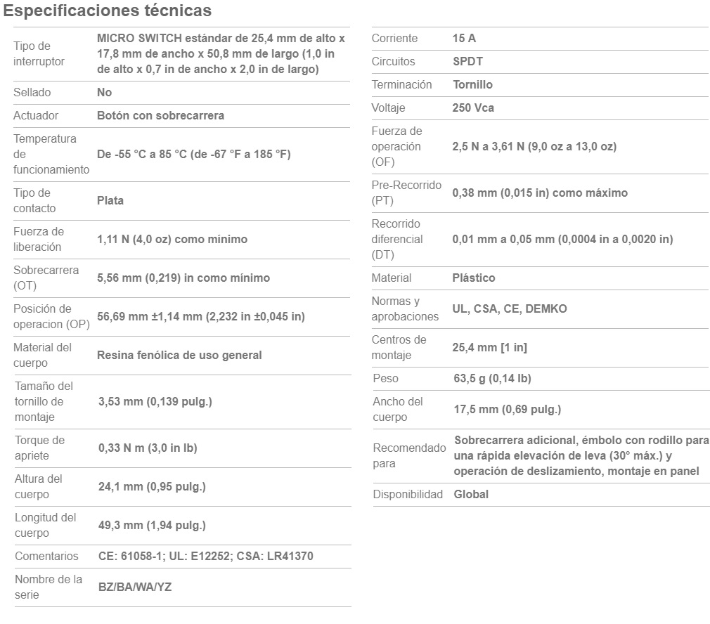 Interruptor básico grande de primera calidad Serie BZ MICRO SWITCH, Circuito de un polo doble tiro, 15 A a 250 VCA, Actuador con botón y sobrecarrera, 2,Fuerza de operación de 5 N a 3,61 N [9 oz a 13 oz], Contactos de plata, Terminales con tornillos, CE, CSA, DEMKO,.
