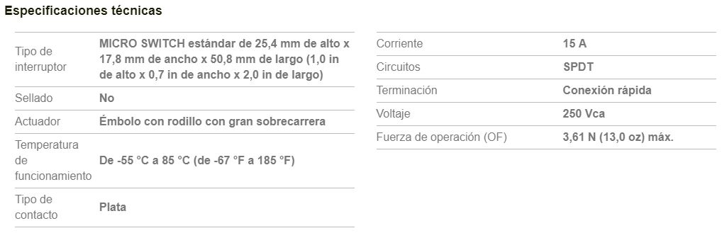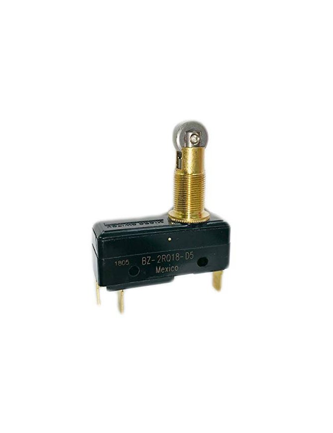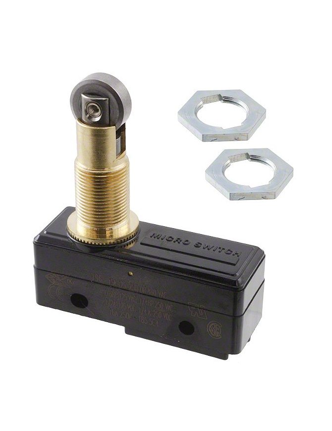 Interruptor básico grande, circuito de un solo polo y doble tiro, 15 A a 250 Vac, Actuador de émbolo de rodillo de sobrevelocidad alta, terminación de conexión rápida, contactos plateados, UL, CSA, ENEC.