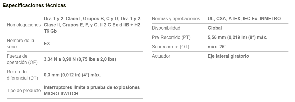 Interruptores límite a prueba de explosiones Serie EX MICRO SWITCH, Eje lateral giratorio, de acción rápida SPDT 1NC 1NA, Conducto 14 NPT de 0,5 in.