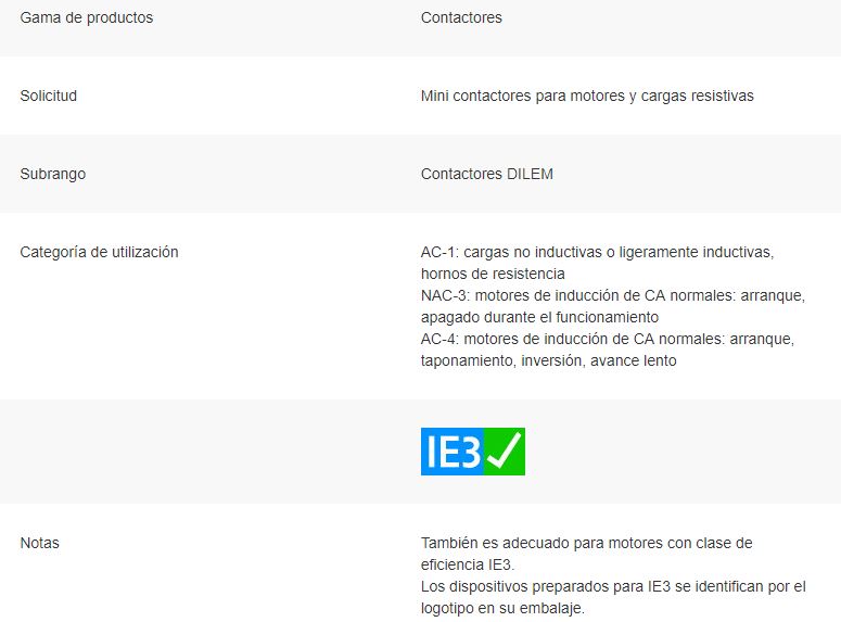 Contactor, aplicación: mini contactores para motores y cargas resistivas, contactores DILEM, categoría de utilización: AC-1: cargas no inductivas o ligeramente inductivas, hornos de resistencia, NAC-3: motores de inducción de CA normales: arranque, apagado durante el funcionamiento, CA -4: Motores de inducción de CA normales: arranque, taponamiento, inversión, avance lento, Técnica de conexión: terminales de tornillo,