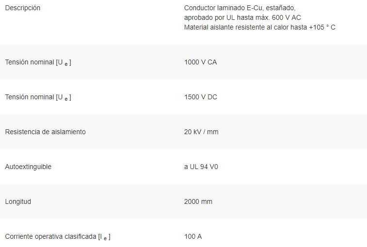 Banda de cobre aislada, conductor laminado E-Cu, estañado, aprobado por UL hasta máx. 600 VCA, material aislante resistente al calor hasta +105 ° C, dimensiones (número de capas x ancho x grosor) = 3x9x0.8 mm, color negro, corriente operativa nominal Ie = 100 A, autoextinguible según UL 94 V0, resistencia de aislamiento según IEC 60243- 1 20 kV / mm, voltaje de funcionamiento nominal Ue = 690VCA