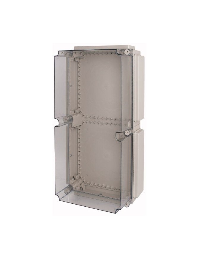 Cubierta transparente ahumada con puerta, grado de protección IP65, sujetadores de cubierta patentados con compensación de sobrepresión integrada, sujetadores de cubierta sellables, junta de espuma continua, profundidad de montaje con placa de montaje = 125 mm, se puede usar para bases CI E, X y V, mecanismo de bloqueo de puerta tipo: operación manual.