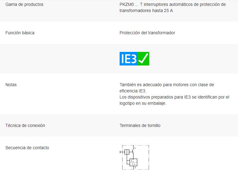 Interruptor automático de transformador de acuerdo con IEC / EN60947, tamaño de 3 polos PKZM0, con sobrecarga ajustable y liberación de cortocircuito no retardada, sensible a fallas de fase, tornillo y ajuste a presión, con terminal de tornillo, dimensión de instalación de la tapa 45 mm, voltaje de operación nominal Ue 690V , grado de protección IP20, a prueba de dedos según VDE 0106 T. 100, accesorios: contacto auxiliar, liberación de tensión.