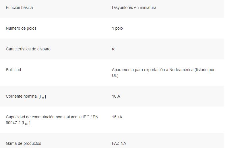Disyuntor en miniatura (MCB) FAZ-NA, 1 polo, característica de disparo: D, corriente nominal en: 10 A, aparamenta para exportación a América del Norte (listado por UL)