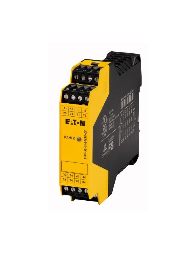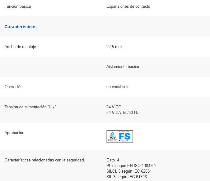 Módulo de expansión de contacto, sin retraso, para extender los contactos en los módulos lógicos de seguridad y la función de tiempo, voltaje de alimentación de 24 VCC o 24 VCA 50 / 60Hz, 5 Habilitar rutas de corriente (IEC / EN 60204 Categoría de parada 0): la unidad base determina la seguridad máxima categoría según IEC 61508 e IEC 60204, 2 rutas de corriente de señal, cubierta de etiqueta de barra colectora según EN 50274 con accionamiento vertical desde la parte frontal a prueba de dedos y dorso de la mano, adecuado para cat. 4 según EN 954-1 / PL e según EN ISO 13849-1 / SILCL3 según IEC 62061 / SIL3 según IEC61508.