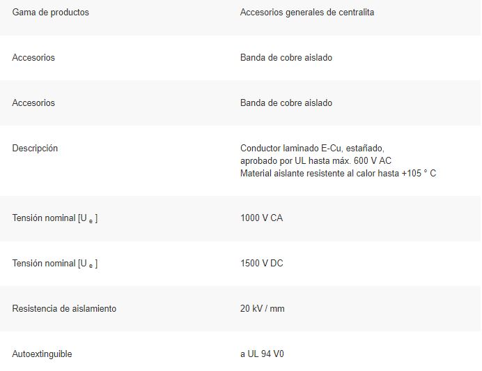 Banda de cobre aislada, conductor laminado E-Cu, estañado, aprobado por UL hasta máx. 600 VCA, material aislante resistente al calor hasta +105 ° C, dimensiones (número de capas x ancho x grosor) = 10x32x1 mm, color negro, corriente operativa nominal Ie = 800 A, autoextinguible según UL 94 V0, resistencia de aislamiento según IEC 60243-1 20 kV / mm, voltaje de funcionamiento nominal Ue = 690VCA