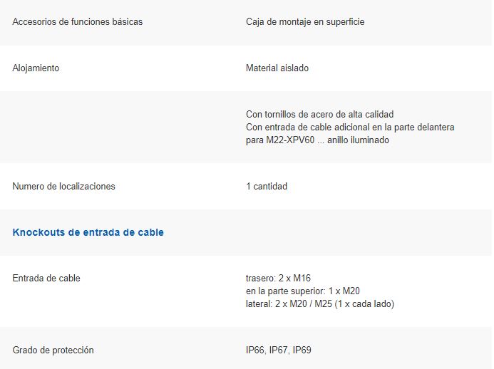 Caja de montaje en superficie, Carcasa: material aislado, Con tornillos de acero de alta calidad, Con entrada de cable adicional en la parte delantera para M22-XPV60 ... anillo iluminado, Número de ubicaciones: 1, Entrada de cable: posterior: 2 x M16, en la parte superior: 1 x M20, lateral: 2 x M20 / M25 (1 x cada lado), Grado de protección: IP66, IP67, IP69K, Color RAL Valor: RAL 1004, Color: Base de carcasa antracita, Conexión a SmartWire-DT: no, Para usar con : 1 x 22.5, Para usar con: Botones de parada controlada / parada de emergencia