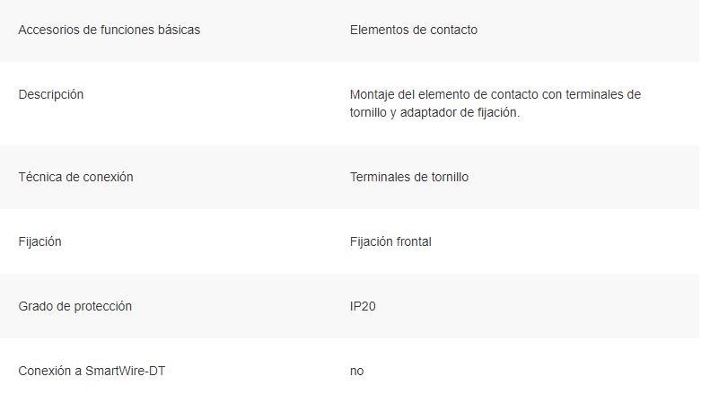 Elemento de contacto, Técnica de conexión: Terminales de tornillo, Fijación: Fijación frontal, Descripción: Montaje del elemento de contacto con terminales de tornillo y adaptador de fijación, Contactos N / A = Normalmente abierto: 1 N / O, Grado de protección: IP20, Conexión a SmartWire- DT: no, Normas: IEC 60947-5-1.