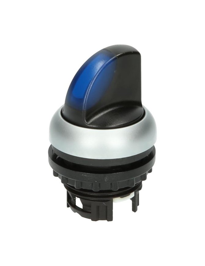 Actuador de interruptor selector iluminado, gama de productos: RMQ-Titan, unidad individual, diseño: con empuñadura, mantenido, 3 posiciones, empuñadura de color: azul, grado de protección: IP66, bisel: titanio, conexión a SmartWire-DT: sí, con conexiones SWD-RMQ, Dimensiones delanteras: 29,7, Instrucciones: Función de retención / retorno por resorte, se puede cambiar con las piezas de codificación M22-XC-Y, Normas: IEC / EN 60947, VDE 0660, Grado de Protección: IP66.