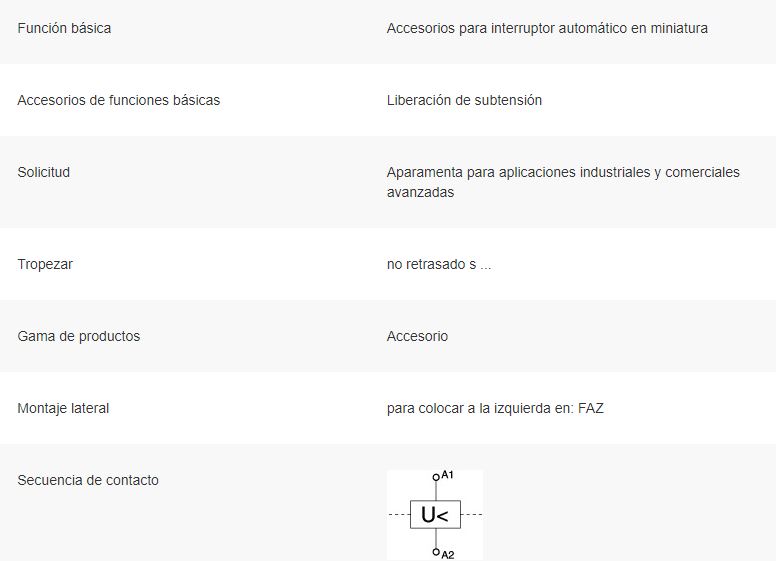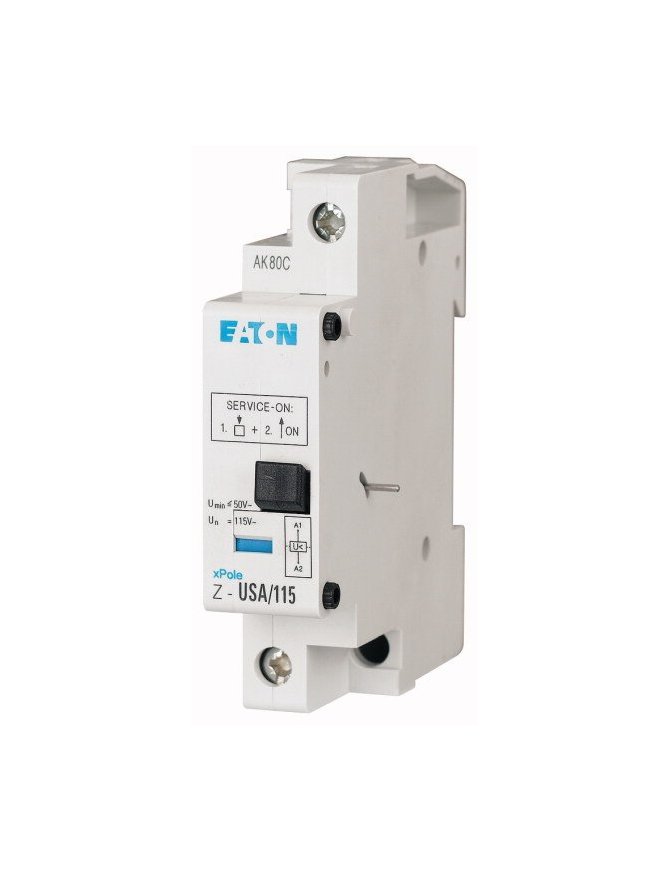 Desenganche de subtensión atornillable, voltaje de funcionamiento nominal de 115 V CA, función no retardada, frecuencia 50-60 Hz, umbral de cierre del 80% de Un, umbral de disparo inferior al 50% de Un, dimensión frontal estándar de 45 mm, ancho de montaje 1 SU (17,5 mm), Montaje en riel superior, sección transversal del terminal 1-2x2.5 mm².