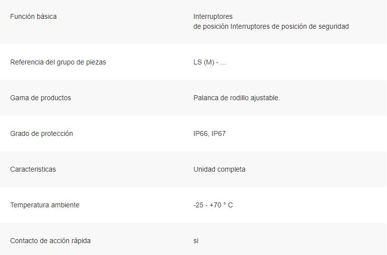 Interruptor de posición, Función básica: Interruptores de posición, Referencia de grupo de pieza: LS (M) -…, Gama de productos: Actuador de barra de resorte, Grado de protección: IP66, IP67, Características: Unidad completa, Temperatura ambiente: -25 - +70 ° C, contacto de acción rápida: sí, descripción: no se debe utilizar como interruptor de posición de seguridad, contactos N / O = normalmente abierto: 1 N / O, contactos N / C = normalmente cerrado: 1 NC, cubiertas de color: amarillo , Carcasa: material aislado.