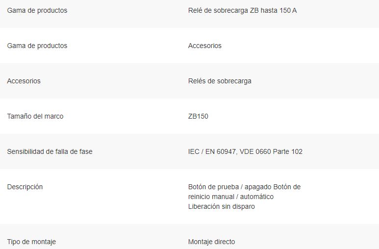 Relé de sobrecarga, Rango de producto: Relé de sobrecarga ZB hasta 150 A, Accesorios: Relés de sobrecarga, Tamaño de bastidor: ZB12, Sensibilidad de falla de fase: IEC / EN 60947, VDE 0660 Parte 102, Descripción: Botón de prueba / apagado, botón de reinicio manual / automático, Liberación sin disparo, Tipo de montaje: Montaje directo, Contactos auxiliares N / O = Normalmente abierto: 1 N / O, Contactos auxiliares N / C = Normalmente cerrado: 1 N / C, Para usar con: DILM7, DILM9, DILM12 , DILM15 ,, DIULM7, DIULM9, DIULM12 ,, SDAINLM12 ,, SDAINLM16 ,, SDAINLM22, Normas: IEC / EN 60947, VDE 0660, UL, CSA, Grado de protección: IP20