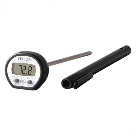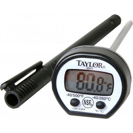 Termómetro digital de bolsillo, rango -50 a 260 °C caratula oval. Vástago de acero inoxidable, interruptores de encendido, apagado y para medir en °C o °F. Tubo de bolsillo.