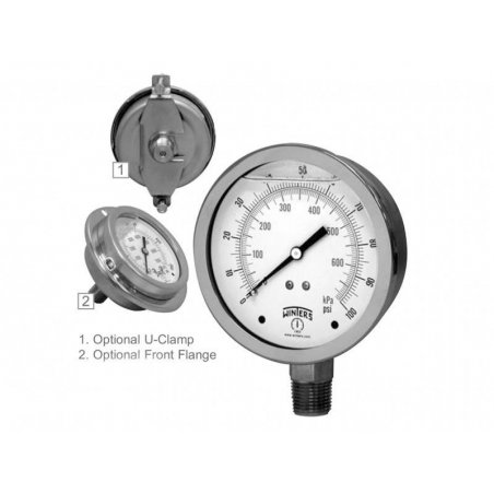 Manómetro caratula de 4" conexión inferior de 1/2" NTP rango de 0/5,000 psi/kPa relleno de glicerina, totalmente en acero inoxidable.