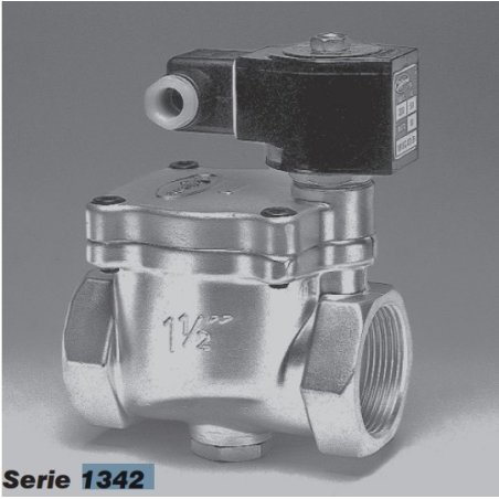 Valvula Solenoide serie 1342, normalmente cerrada, cuerpo en laton, internos en Teflón para uso vapor, servo operada (0.5 - 10 bar), conexión al sistema de 1 1/2" npt, orificio interno de 38 mm, Temp max de fluido 150°C. Disponible 12,24, DC, 24,120,220,240, / 50-60 Hz