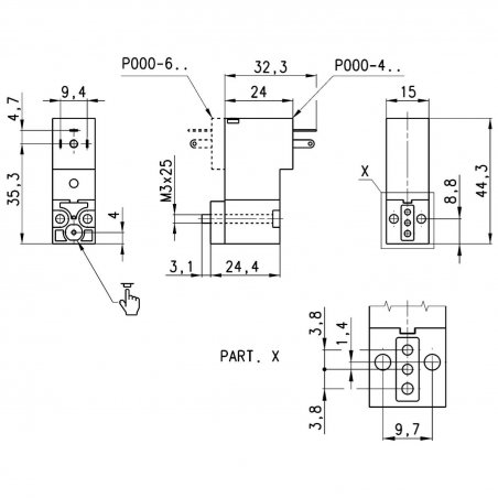 Function Operation Pneumatic connections Nominal diameter Nominal flow Flow coefficient kv (l/min) Operating pressure Operating temperature Media Response time (ISO 12238) Manual override Installation | 3/2 NC - 3/2 NO direct acting poppet type on subbase with ISO 15218 interface by means of screws 0.8 … 1.5 mm 14 … 35 Nl/min (air @ 6 bar ΔP 1 bar) 0.21 … 0.54 0 ÷ 3 … 10 bar 0°C ÷ 50°C filtered air, class 5.4.4 according to ISO 8573-1 (max oil viscosity 32 cSt), inert gas ON <10 msec - OFF <15 msec monostable button in any position |