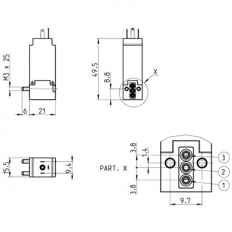 Function Operation Pneumatic connections Nominal diameter Nominal flow Flow coefficient kv (l/min) Operating pressure Operating temperature Media Response time (ISO 12238) Installation | 3/2 NC direct acting poppet type on subbase with ISO 12238 interface by means of screws 0.8 mm 12 Nl/min (air @ 6 bar ΔP 1 bar) 0.19 0 ÷ 10 bar 0°C ÷ 50°C filtered air, class 5.4.4 according to ISO 8573-1 (max oil viscosity 32 cSt), inert gas ON <10 msec - OFF <15 msec in any position |