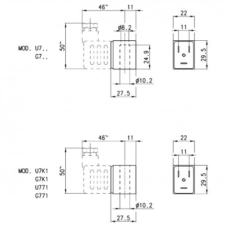 Clase de protección | IP54 - DIN 40050 IP65 (con conector Mod. 122-800 y Mod. 122-800EX) | IP54 - DIN 40050 IP65 (con conector Mod. 124-800) | IP54 - DIN 40050 IP65 (con conector Mod. 124-800) | IP64 | |