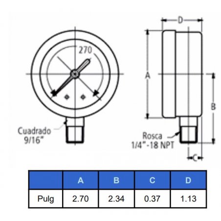• Carátula 2 1/2” (63.5 mm). Color de fondo blanco, caracteres negros y escala dual en kg/cm2 y lb/pulg2. (opciones diferentes escalas)