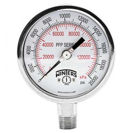 - Tapón ventajoso en manómetros de acero inoxidable de 2,5" a 4,5" (6,35 a 11,4 cm), de montaje inferior de latón de 4,5" (11,4 cm) y de montaje posterior de acero inoxidable de 4" (10,2 cm)