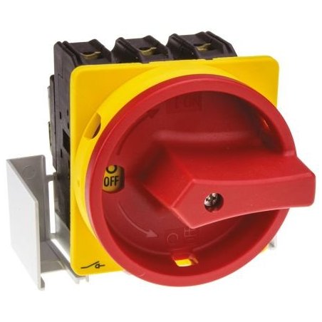 Interruptor principal, gama de productos: interruptor principal, interruptor de mantenimiento, interruptor de reparación, referencia del grupo de piezas: T3, función de parada: función de apagado de emergencia, con mango giratorio rojo y anillo de bloqueo amarillo, 4 polos, grado de protección: frontal IP65, diseño: Montaje empotrado, Ángulo de conmutación: 90 °, Clasificación del motor AC-23A, 50-60 Hz 400 V: P = 15 kW, Corriente nominal ininterrumpida: Iu = 32 A, 2 unidad (es) de contacto, Normas: IEC / EN 60947, VDE 0660, IEC / EN 60204, CSA, UL, Interruptor-seccionador según IEC / EN 60947-3