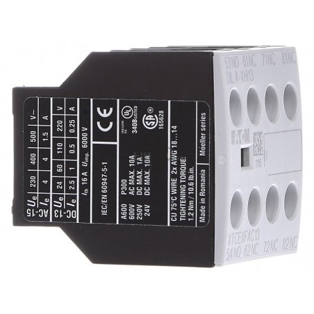 Módulo de contactos auxiliares, con contactos opuestos enclavados, elementos de conmutación según EN 50005, las combinaciones de la versión E corresponden a EN 50011 y son preferibles., El contactor accionado por CC DILA (C) -22 solo debe combinarse con contactos auxiliares de 2 polos ., Función: para aplicaciones estándar, 4 polos, Técnica de conexión: terminales de tornillo, Corriente nominal de funcionamiento AC-15 220 V 230 V 240 V: Ie = 4 A, Corriente nominal de funcionamiento AC-15 380 V 400 V 415 V: Ie = 4 A, Contactos N / O = Normalmente abierto: 2 N / O, Contactos N / C = Normalmente cerrado: 2 NC, Tipo de montaje: Fijación delantera