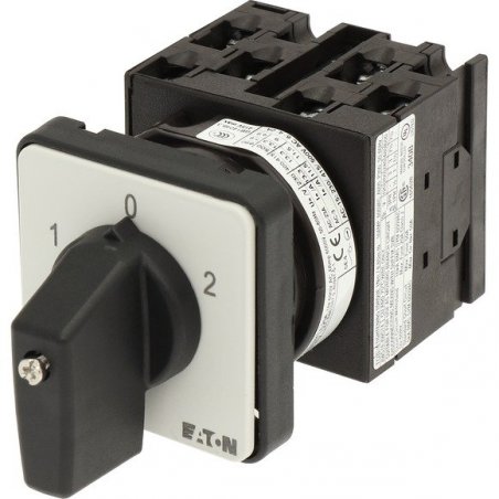 Interruptor de cambio, Gama de productos: Interruptores de control, Referencia del grupo de piezas: T0, con empuñadura negra y placa frontal, Contactos: 6, Grado de protección: Frontal IP65, Diseño: montaje empotrado, Ángulo de conmutación: 60 °, Rendimiento de conmutación: mantenido, Con posición 0 (apagado), placa frontal: 1-0-2, clasificación del motor AC-23A, 50-60 Hz 400 V: P = 5,5 kW, corriente nominal ininterrumpida: Iu = 20 A, 3 unidades de contacto, Normas: IEC / EN 60947, VDE 0660, IEC / EN 60204, CSA, UL, Interruptor-seccionador según IEC / EN 60947-3
