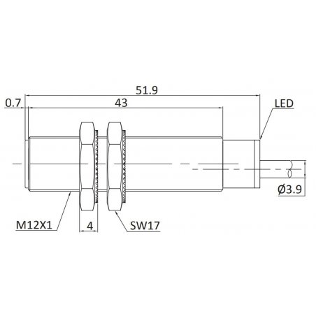 Detector inductivo, Carcasa cilíndrica roscada M12, Distancia de conmutación 2mm, rasante, IP67, -40...70°C, PNP NA, Cable 2m