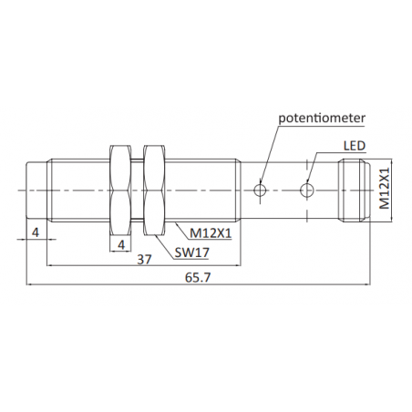 Sensor capacitivo, Carcasa cilíndrica roscada metálica M12, Distancia de conmutación 4mm, no enrasable, IP67, -25...70°C, PNP NA, M12 x 1