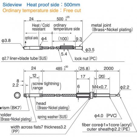 Cabezal de fibra, Resistente al calor hasta 200°C, Barrera, Vista lateral, Resistente al calor 500 mm de largo, R25, 2 m