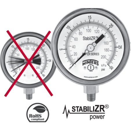 Acero inoxidable 304 (topes de sobrecarga y subpresión de 4" y 6") y movimiento amortiguado StabiliZR™ (silicona en cámara sellada) |