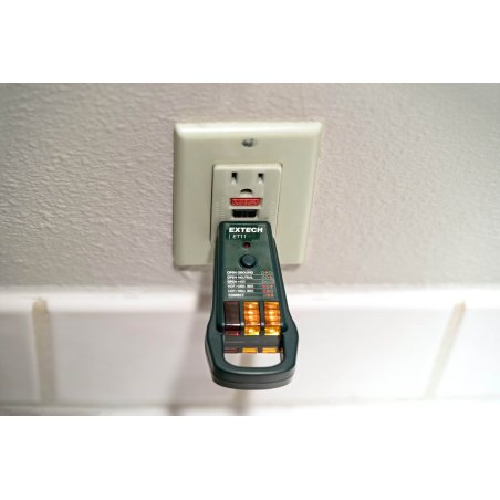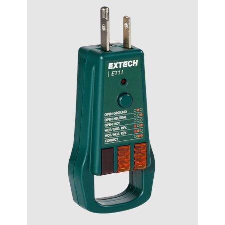 El Extech ET11 es un probador de receptáculo de interruptor de circuito de falla a tierra (GFCI) para tomacorrientes eléctricos tipo B. Prueba los circuitos GFCI en busca de cableado defectuoso en receptáculos de 3 hilos en circuitos de 110-125 V CA, 50/60 Hz. El ET11 verifica los receptáculos cableados correctamente y detecta varias fallas de cableado diferentes, que incluyen: tierra abierta, neutro abierto, abierto caliente, retroceso caliente/tierra y retroceso caliente/neutro con luces que indican la condición del circuito. Con características convenientes como una barra de tracción ergonómica y una leyenda en ambos lados del dispositivo, el ET11 garantiza una inspección segura y confiable de los tomacorrientes en todo momento.