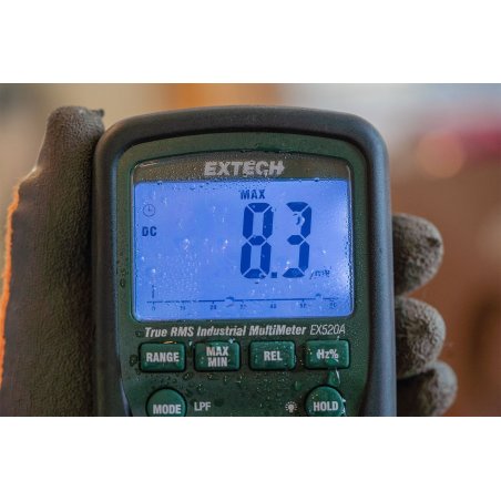 El multímetro industrial EX520A es un equipo de verdadero valor eficaz, resistente y preciso, ideal para profesionales eléctricos y HVAC. Mide voltaje, corriente, resistencia, capacitancia, frecuencia, y temperatura con termopar tipo K y sonda de hilo. Ofrece una pantalla LCD retroiluminada de 6000 cuentas, precisión del 0.09%, funciones de retención de datos y encendido automático. Tiene clasificación de seguridad CAT IV-600 V e IP67 contra agua y polvo.