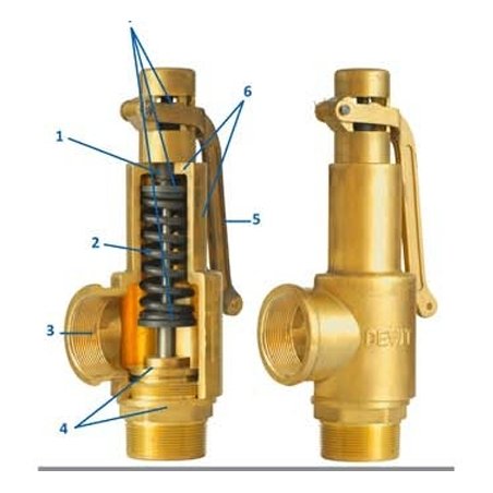 Puestos que la mayor parte de estos fluidos, son fluidos comprimibles, esta acción es caracterizada por una rápida y total apertura rompimiento al alcanzar el punto de ajuste de la válvula, elimiando la sobre presión existente. Las válvulas de seguridad DE-WIT en una primera etapa están construidas para fluidos no corrosivos o que no agredan al bronce(vapor, agua, aire). Para proteger un recipiente que contiene vapor a presión es necesario tener en cuenta los siguientes datos: Medida Fluido a Manejar Presión de ajuste Temperatura de Operación Capacidad de descarga requerida